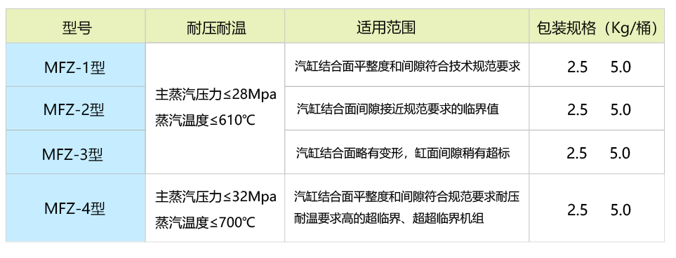 依據(jù)結(jié)合面平整度間隙情況選用不同型號產(chǎn)品,參照下表。對于缸面變形嚴(yán)重,間隙較大的機(jī)組,需做必要的處理,達(dá)到規(guī)范標(biāo)準(zhǔn)后,再選用相應(yīng)型號的產(chǎn)品。